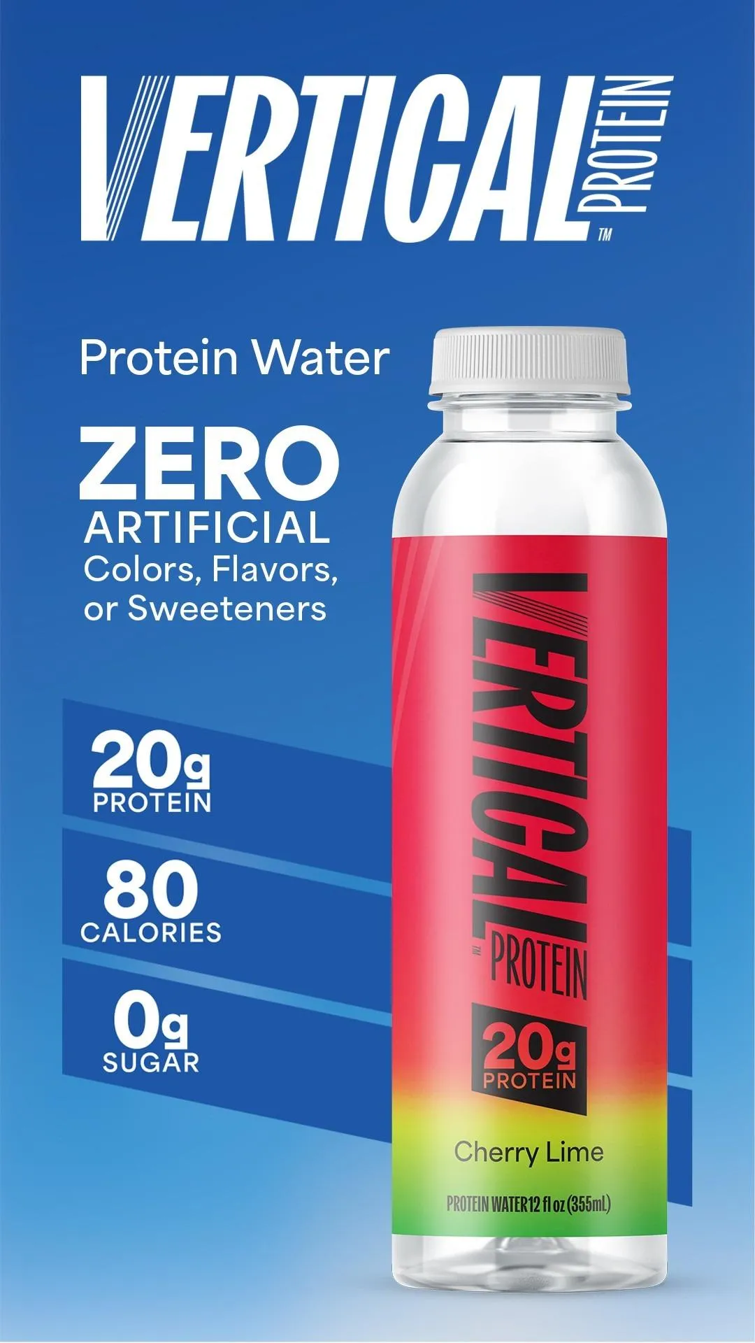 The idea was straightforward, but bringing it to life was anything but. Dozens of formulations, countless taste tests, and an uncompromising commitment to quality led to what Vertical is today: a perfectly balanced protein water crafted with clean, premium ingredients. No artificial flavors. No artificial colors. And now—no artificial sweeteners. Just crisp, smooth hydration with 20 grams of high-quality protein in every 12-ounce bottle.