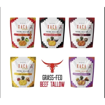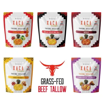 Introducing a new line of better-for-you corn tortilla chips from Xaca Cantina. Made from organic corn, mineral-rich Baja Gold Sea Salt, and Non-GMO avocado oil or grass-fed beef tallow, they’re available in five unique, delicious flavors. Each bag of Xaca chips (5 oz) is a celebration of real, premium ingredients - always gluten-free and vegan.