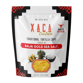 Baja Gold Salt: Made from organic corn and Non-GMO avocado oil. Salty with a mineral-rich edge, thanks to authentic Baja Gold Sea Salt. This is the OG tortilla chip. Each bag of Xaca chips (5 oz) is a celebration of real, premium ingredients - always gluten-free, Non-GMO and vegan.